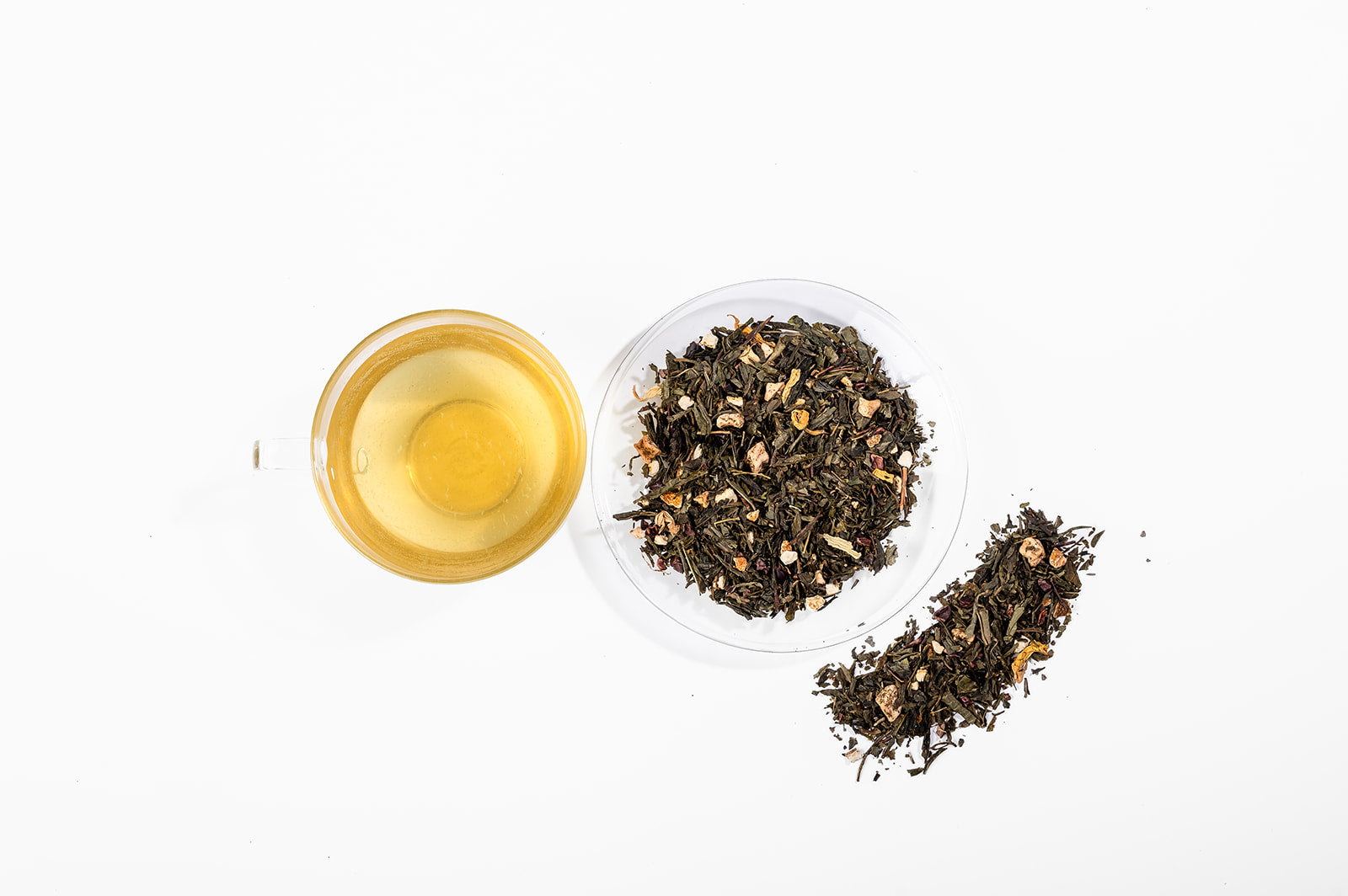 Indulge in the luxurious flavors of Orange Liqueur Tea; a tantalizing green tea blend infused with the vibrant essence of ripe oranges and the decadent richness of a liqueur blend of flowers, truffles and chocolate.. With each sip, experience the citrusy brightness and velvety smoothness, reminiscent of a perfectly crafted cocktail.